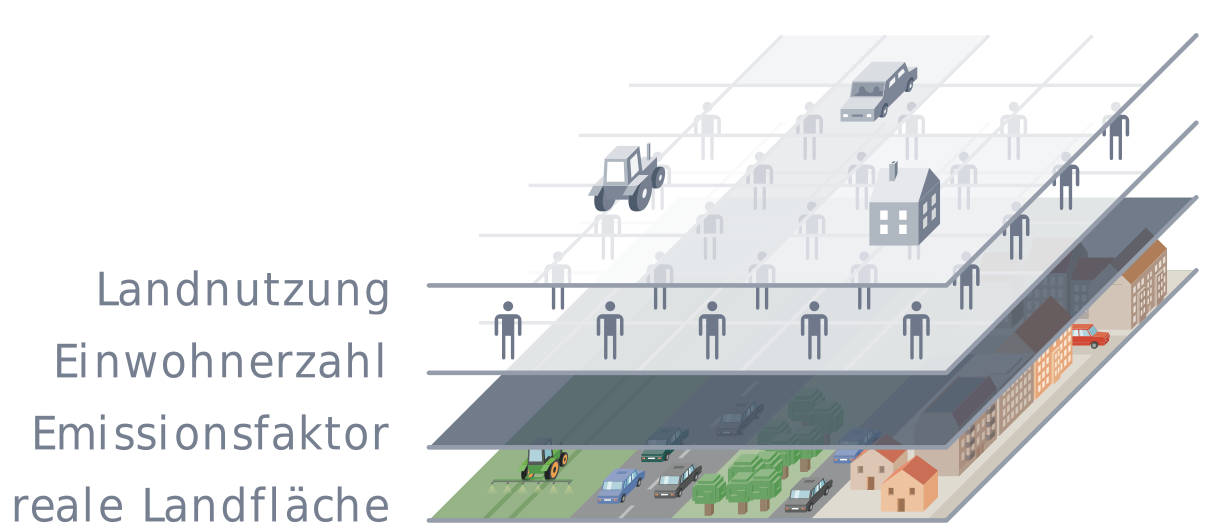 Aktivitätsraten, wie Landnutzung und Einwohnerzahl stehen in Relation zum Emissionsfaktor, woraus die stoffspezifischen Faktoren berechnet werden.